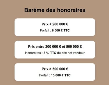 Mes honoraires sont de 3% du prix de vente ; j'applique un barème minimum de 6 000€ et maximum de 15 000€.