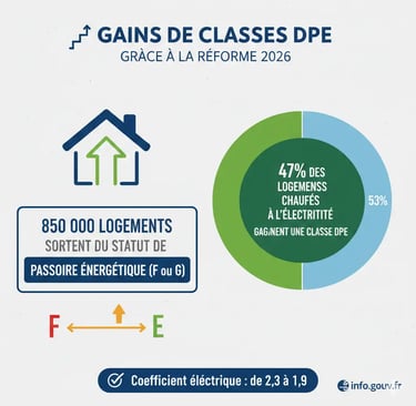 ✅ Le coefficient électrique passe de 2,3 à 1,9, améliorant mécaniquement la note de nombreux logements chauffés à l’électricité. (info.gouv.fr)