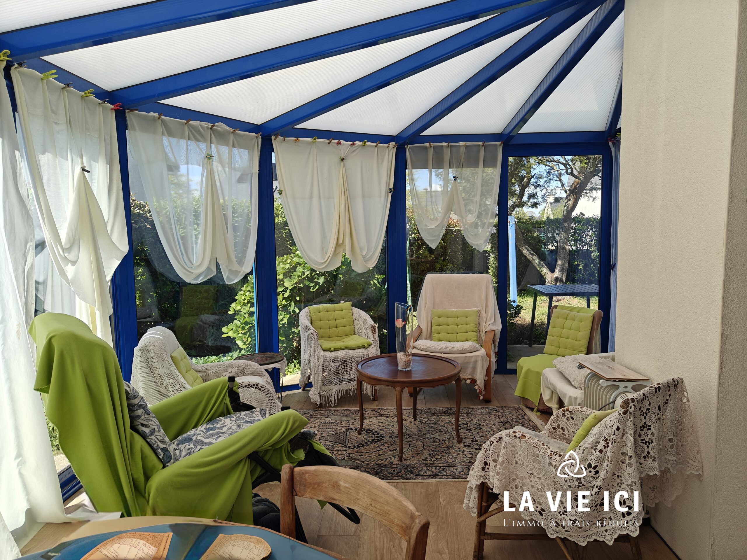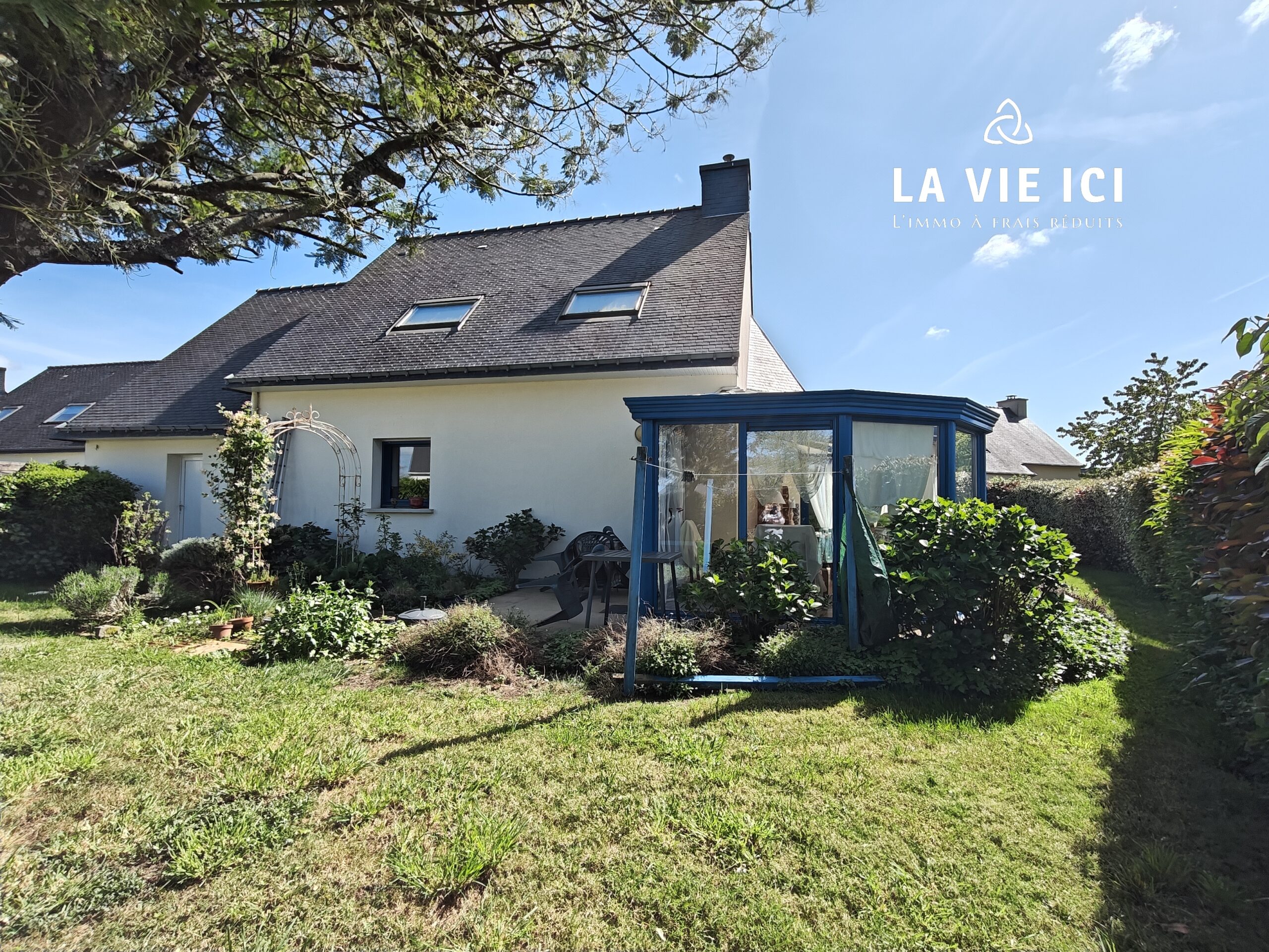 À l’extérieur, le jardin clos et arboré de 523 m² offre un environnement préservé, à l’abri des regards et du vent.