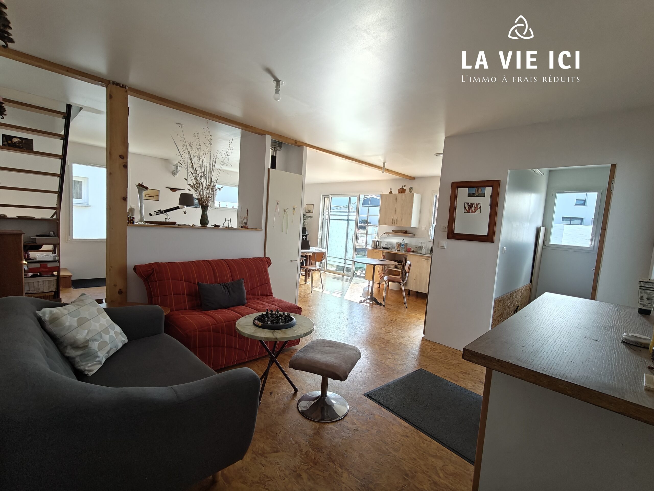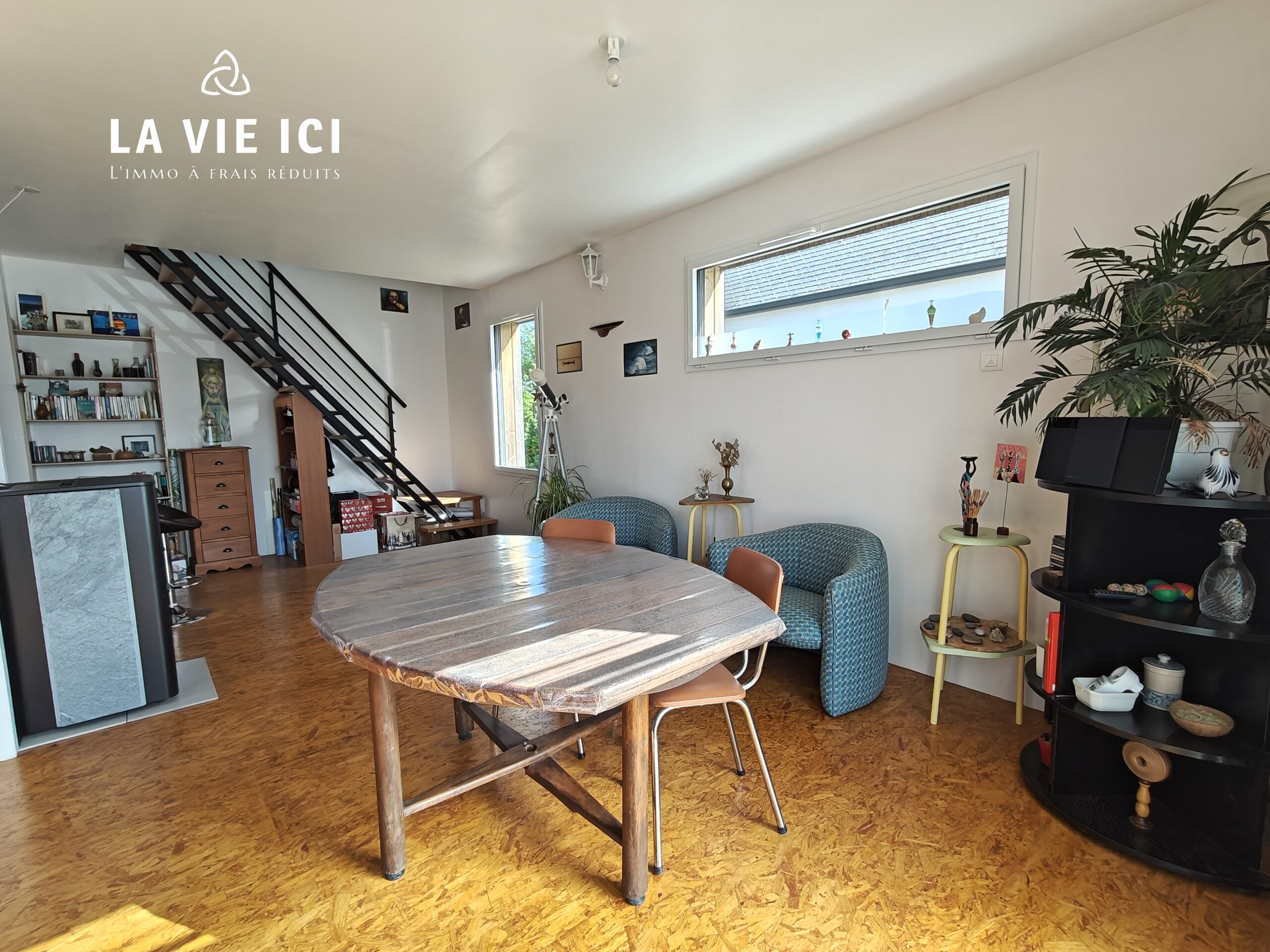 La pièce de vie de 42 m², exposée Sud Ouest accueille une cuisine aménagée et équipée ouverte sur le salon et le séjour, chauffé par un poêle à granulés et donnant sur la terrasse